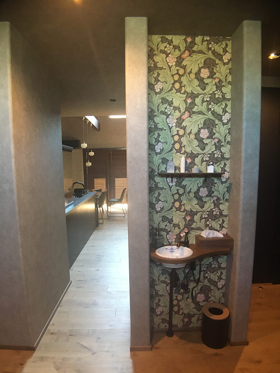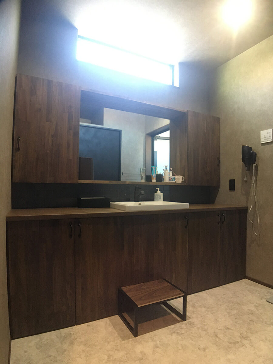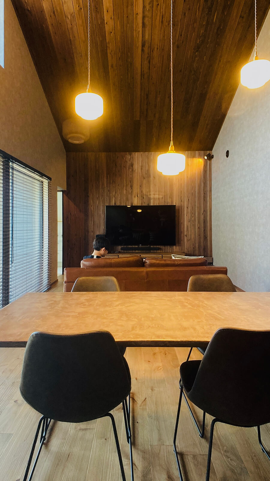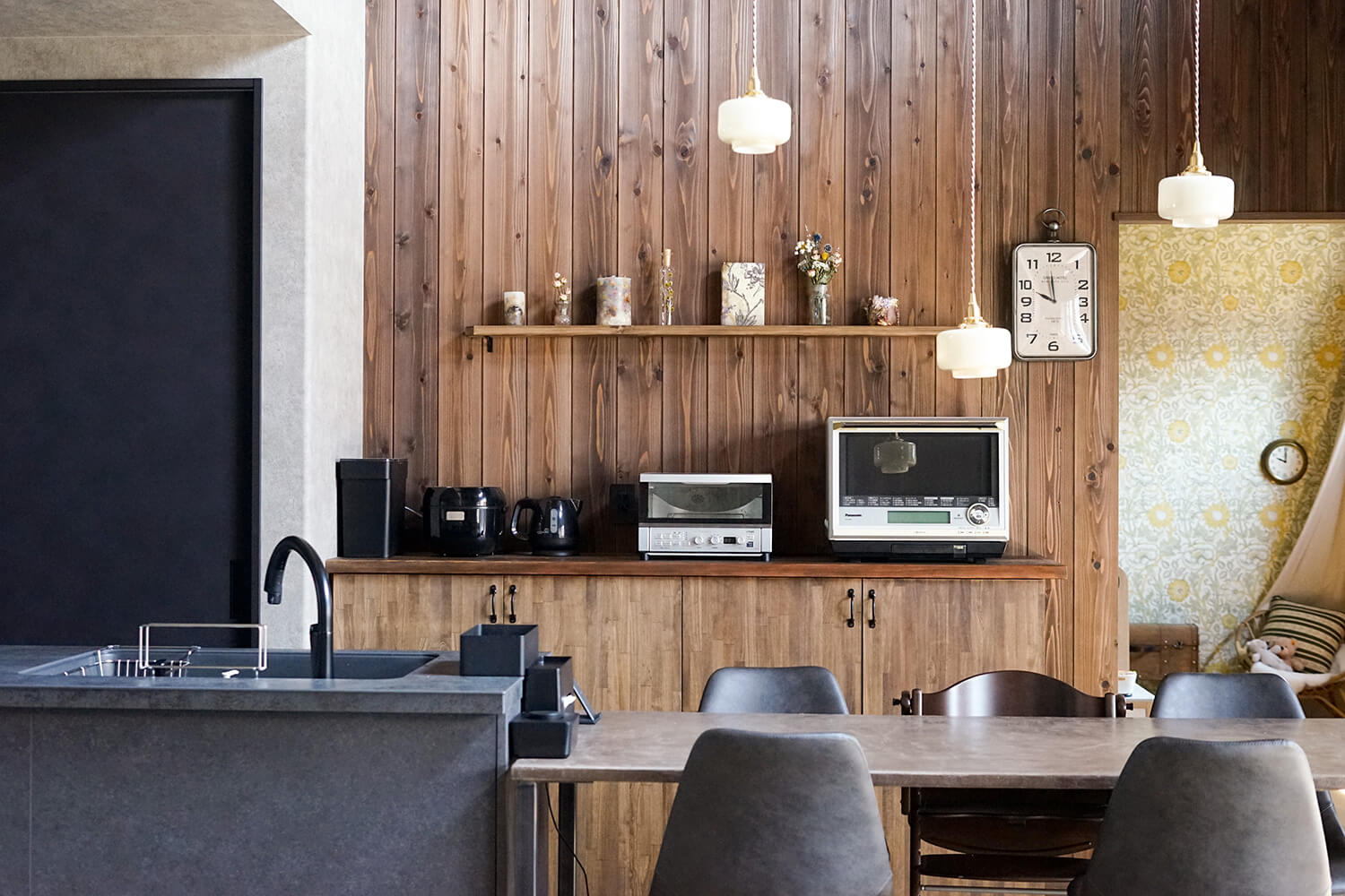 デザインは夫婦揃っての希望の「ブラック」を基調とし、羽目板やモールテックステーブル・セラミックキッチンなど異素材をアクセントで使用したトーンを落とした雰囲気になっています。