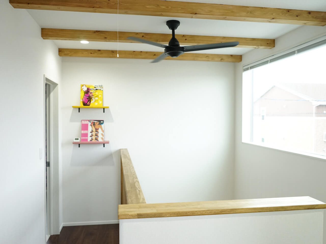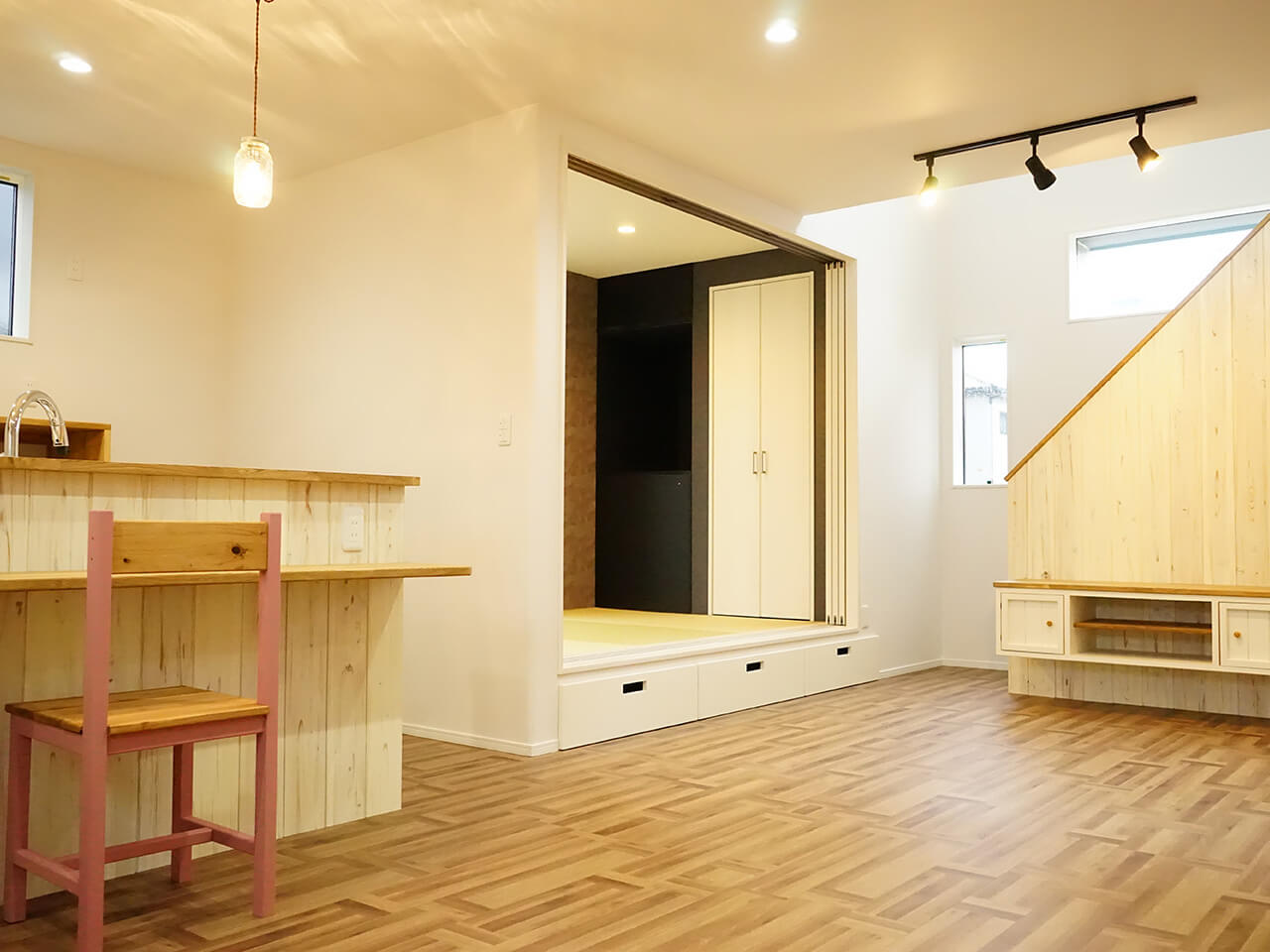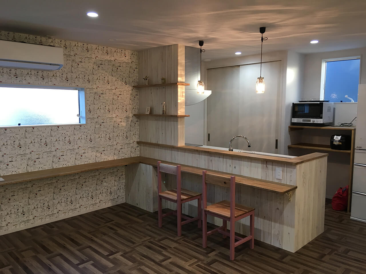 家族3人+犬3匹のそれぞれのライフスタイルに合わせ、間取りとデザインを変えました。かつZEH住宅にすることで夏は涼しく冬は暖かく、家の何処に居ても温度差の少ない一体感のある住宅です。ポップな配色で構成されている空間達ですが、羽目板やカウンター材・表しの梁などの木材が協調性を出し、まとまりのある空間になっています。