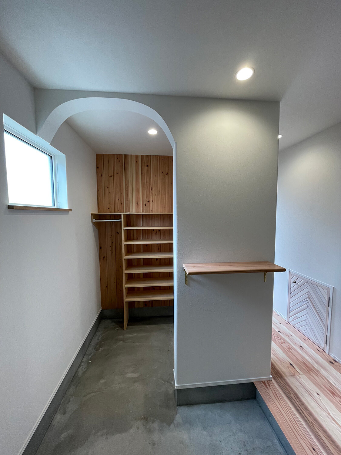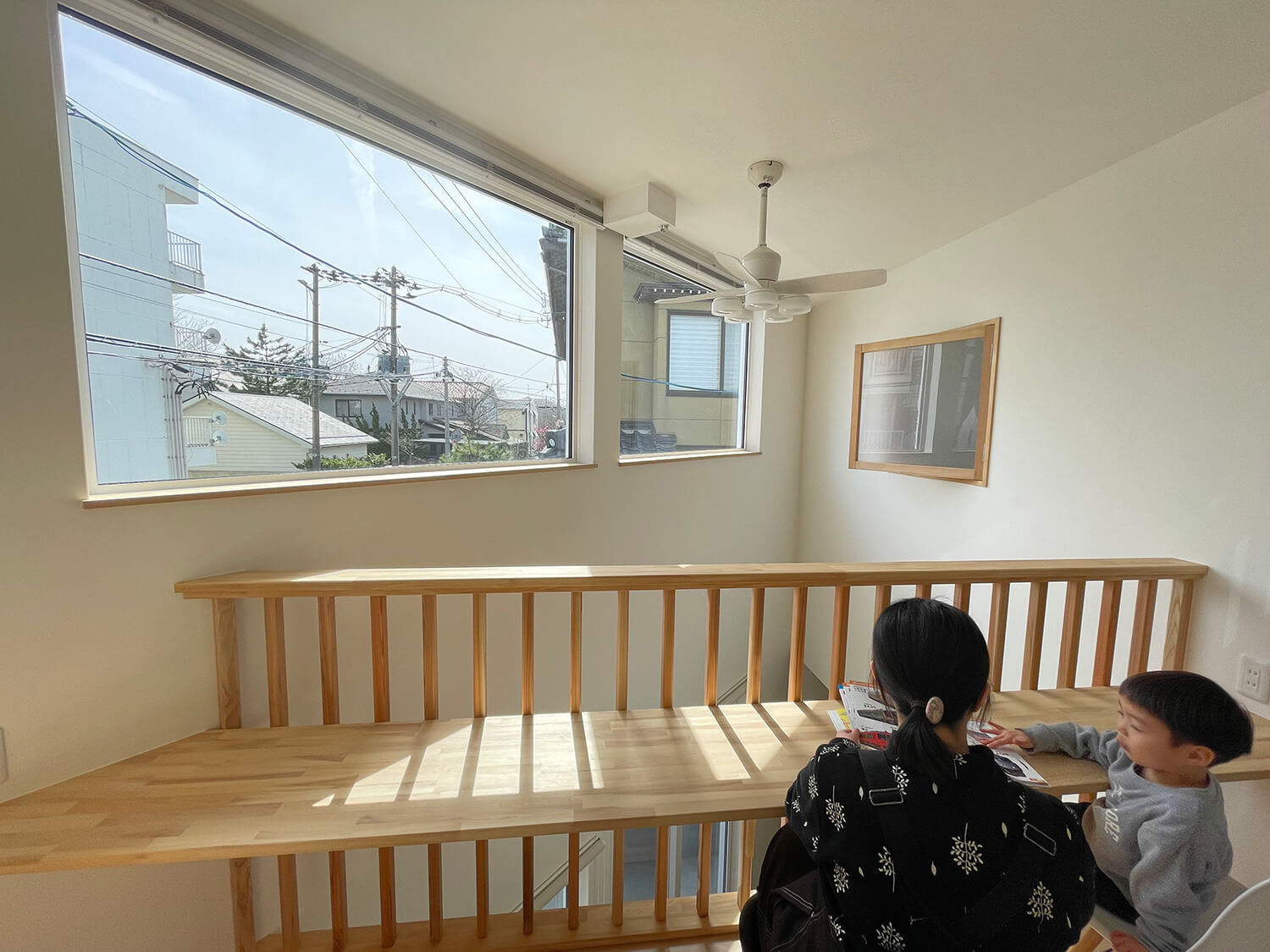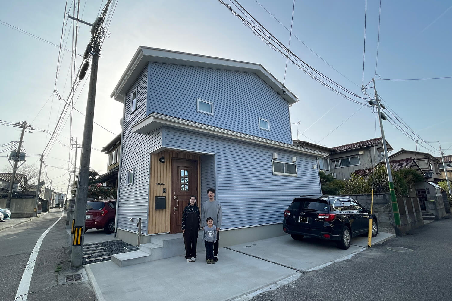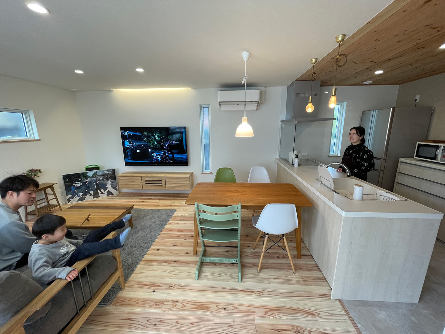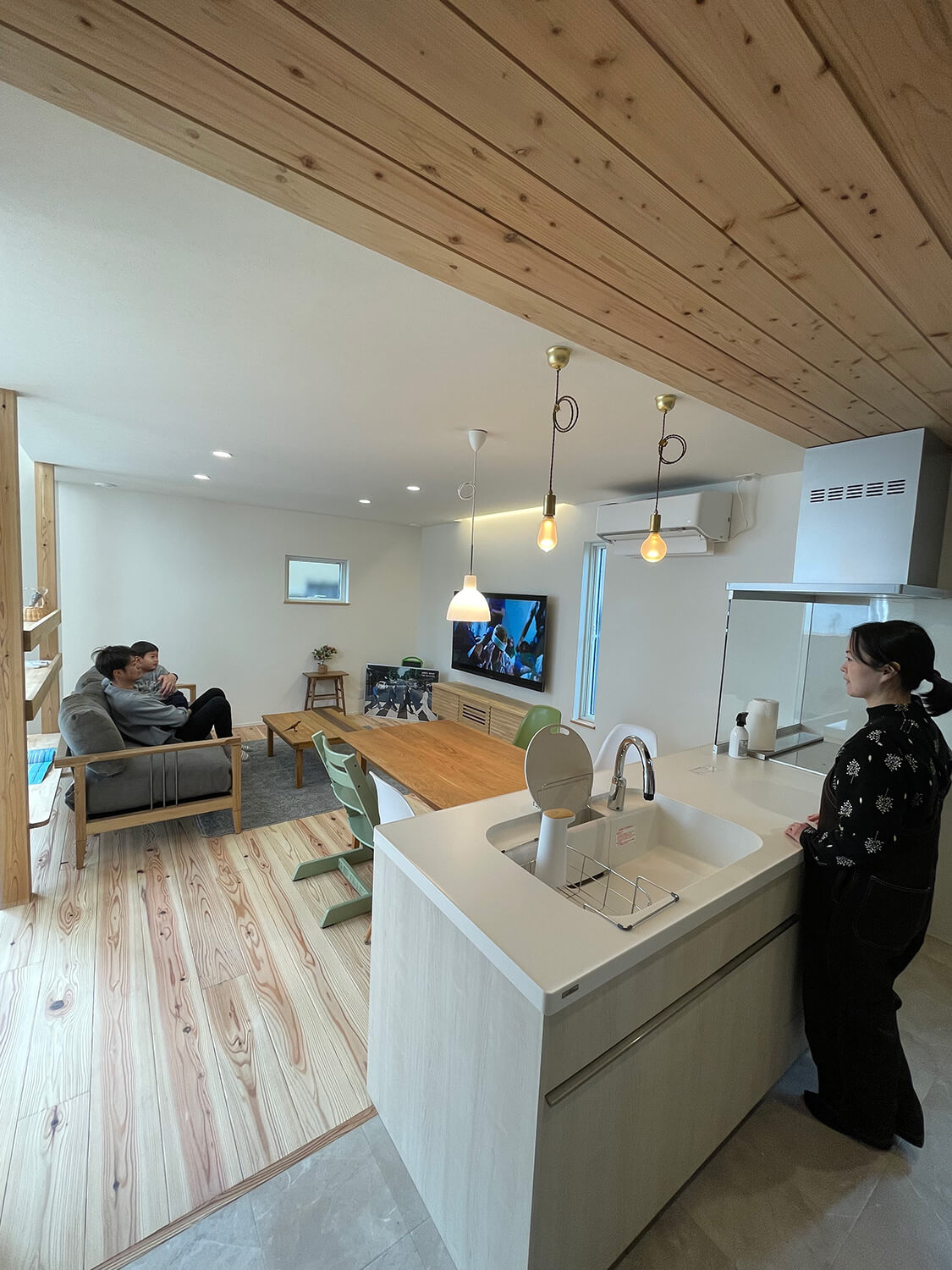 構造面でも耐震等級3を取得して長期優良住宅認定を取得。外装は海が近いため樹脂サイディング+ログの羽目板張り。内装は無垢板を天井と床にふんだんに使用し柔らかく優しい雰囲気に仕上がりました。