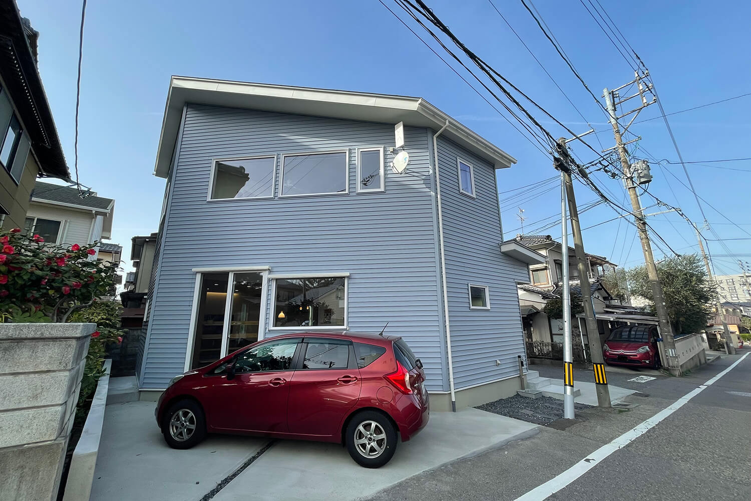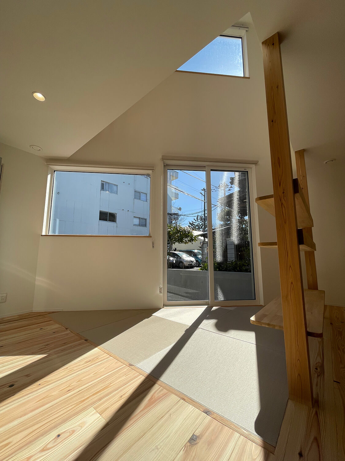 前面道路が狭い住宅街の一角に建築した物件。道路側は真南から45度傾いていたため、建物を45度切り取り、真南に窓と吹き抜けを設けることにより住宅街でも開放的な空間と陽当たりの確保に成功しました。