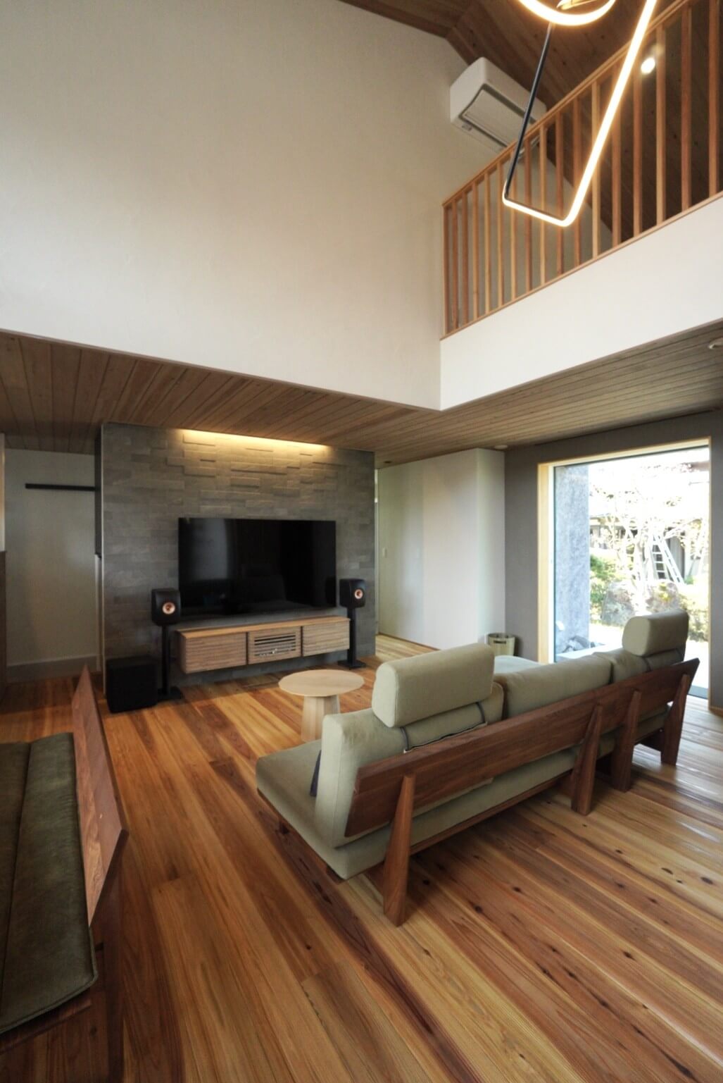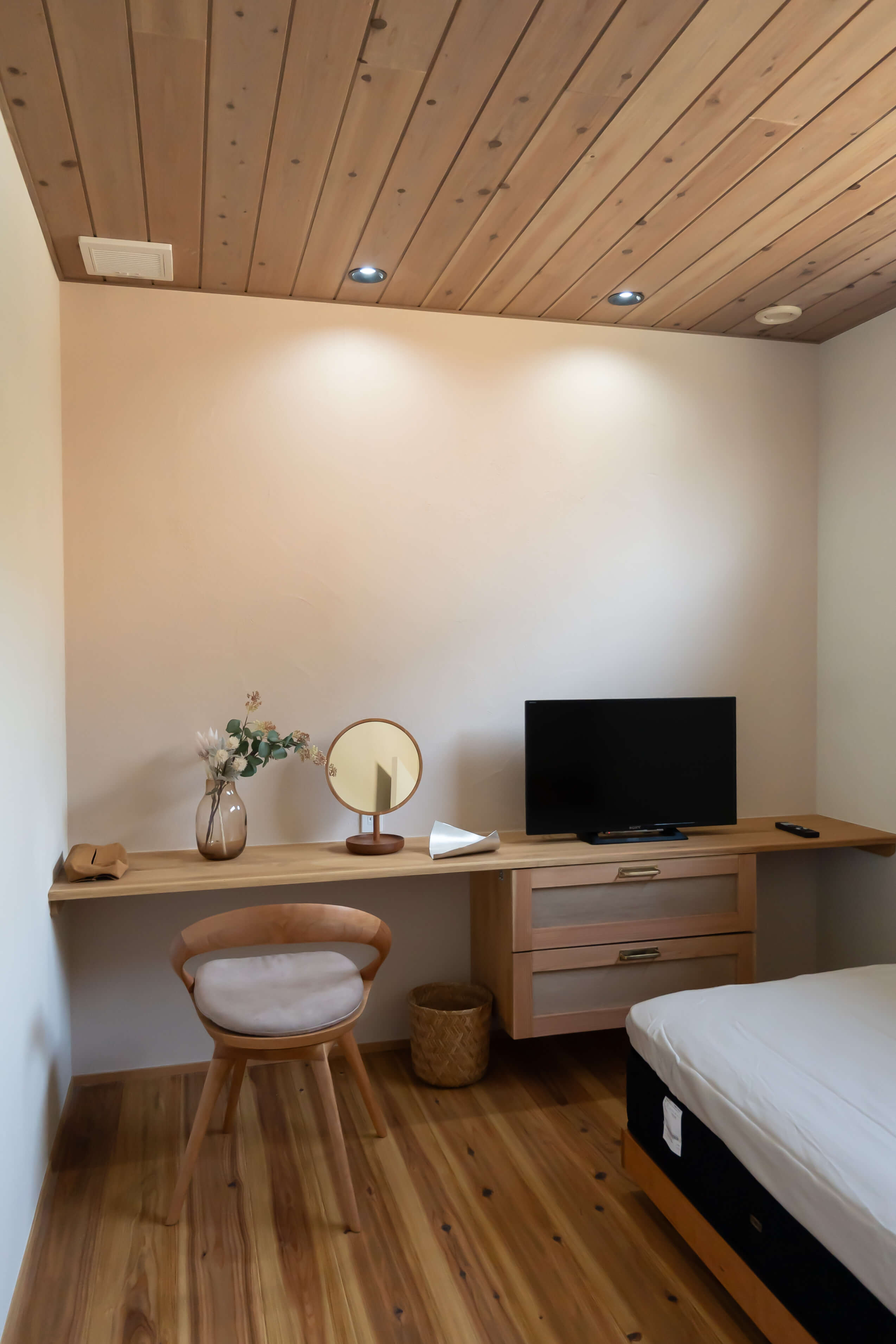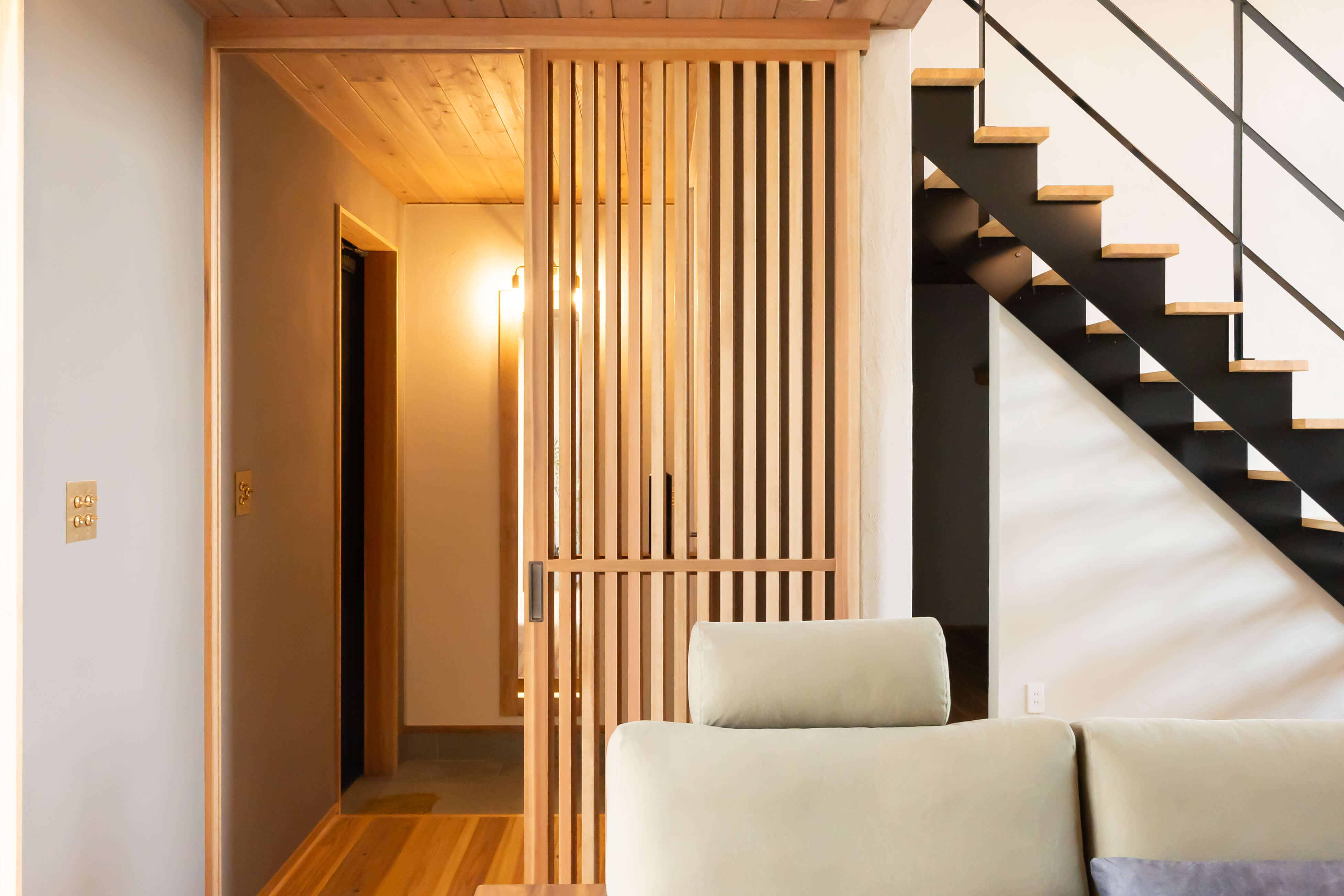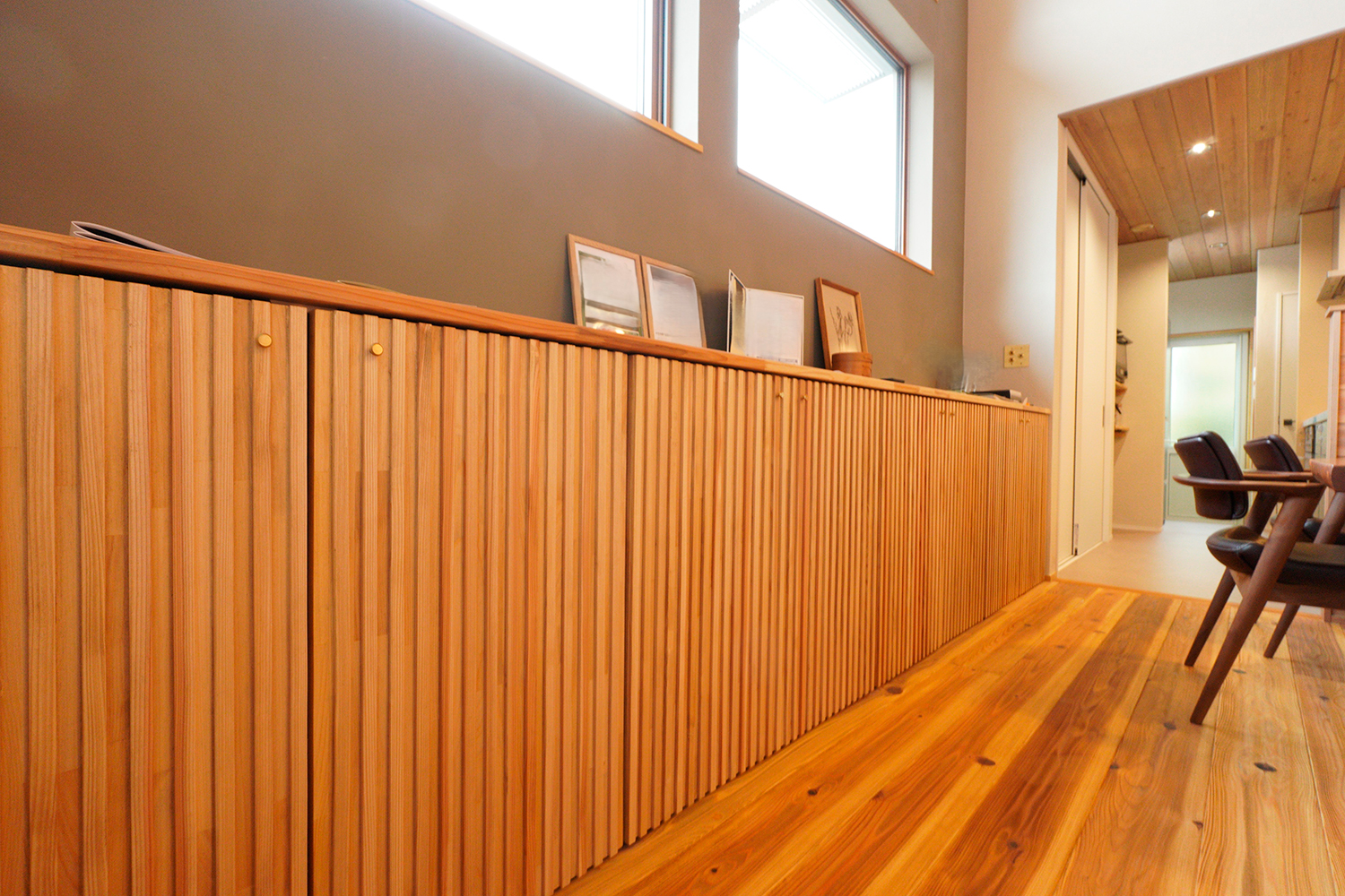 内外装は火山灰シラスが原料のそとん壁を使用し、風合いだけでなく耐久性、防水性、断熱性、調湿性に優れているため、より快適な空間を実現しています。また、壁だけでなく床や天井、格子ドアや収納扉など、随所に無垢材をふんだんに使い、家全体が自然素材の優しい風合いで包まれています。