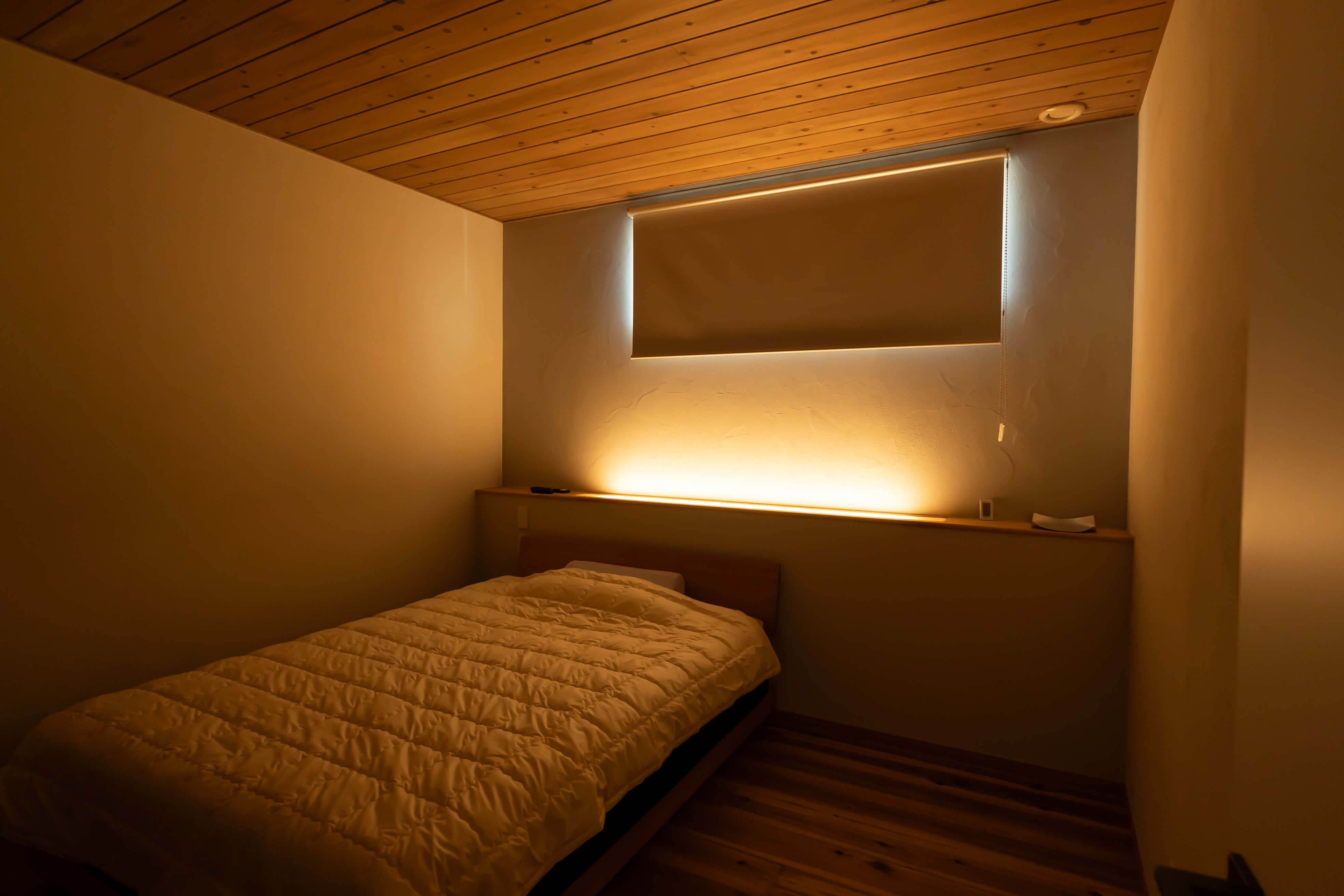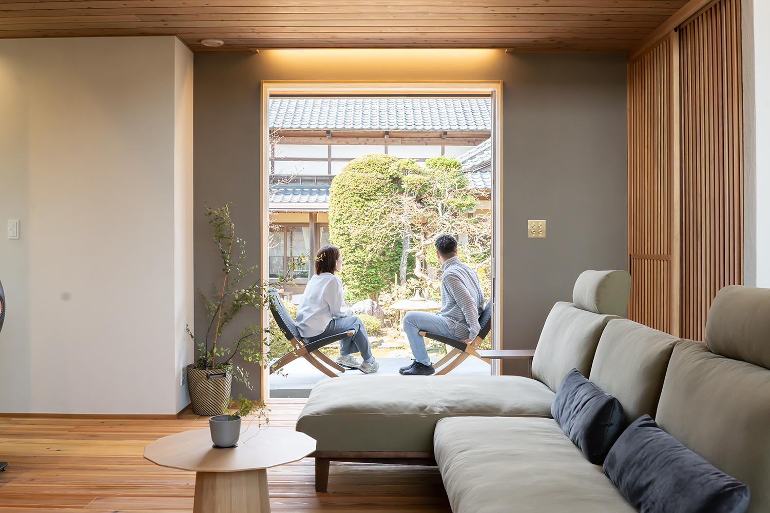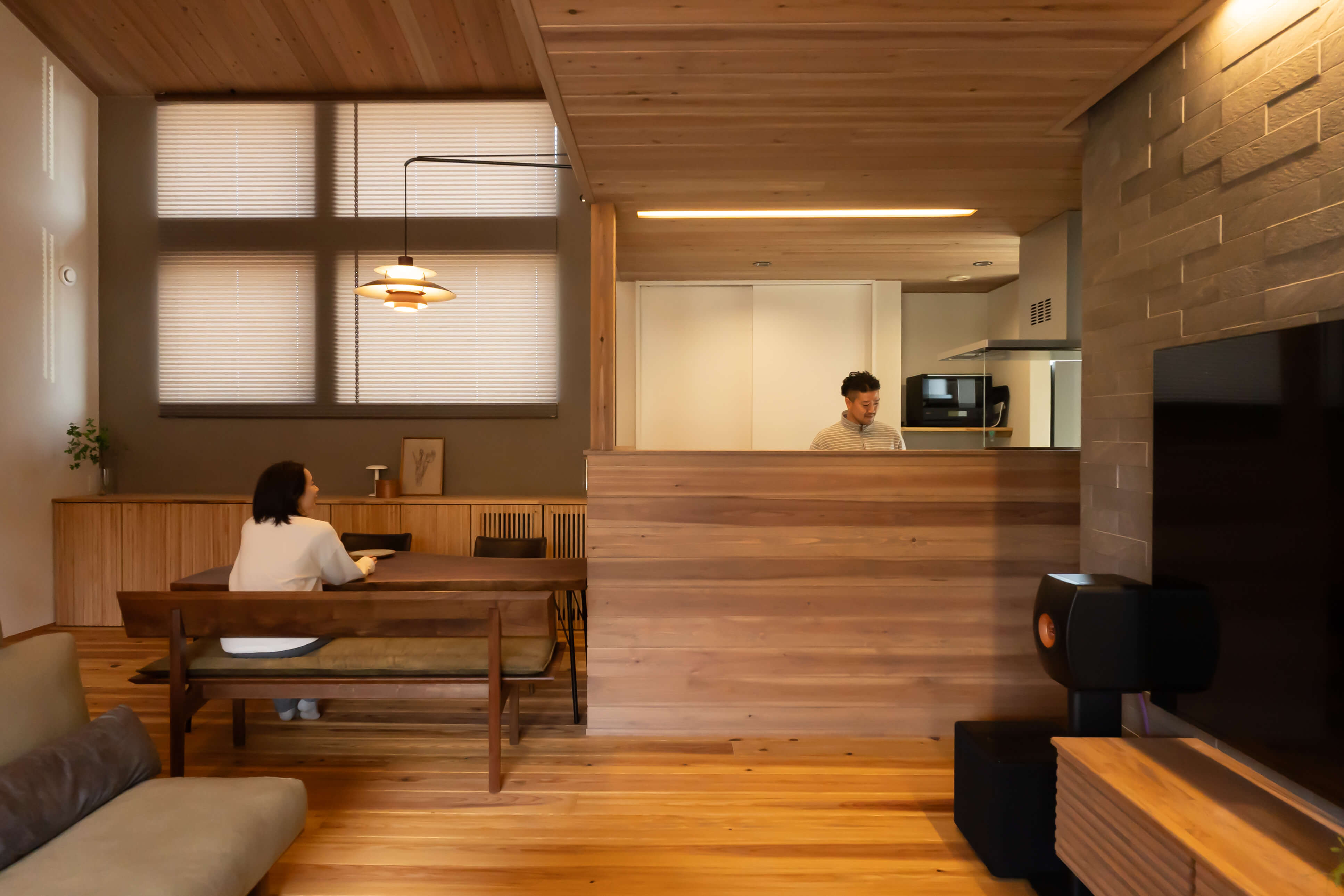 内外装は火山灰シラスが原料のそとん壁を使用し、風合いだけでなく耐久性、防水性、断熱性、調湿性に優れているため、より快適な空間を実現しています。また、壁だけでなく床や天井、格子ドアや収納扉など、随所に無垢材をふんだんに使い、家全体が自然素材の優しい風合いで包まれています。