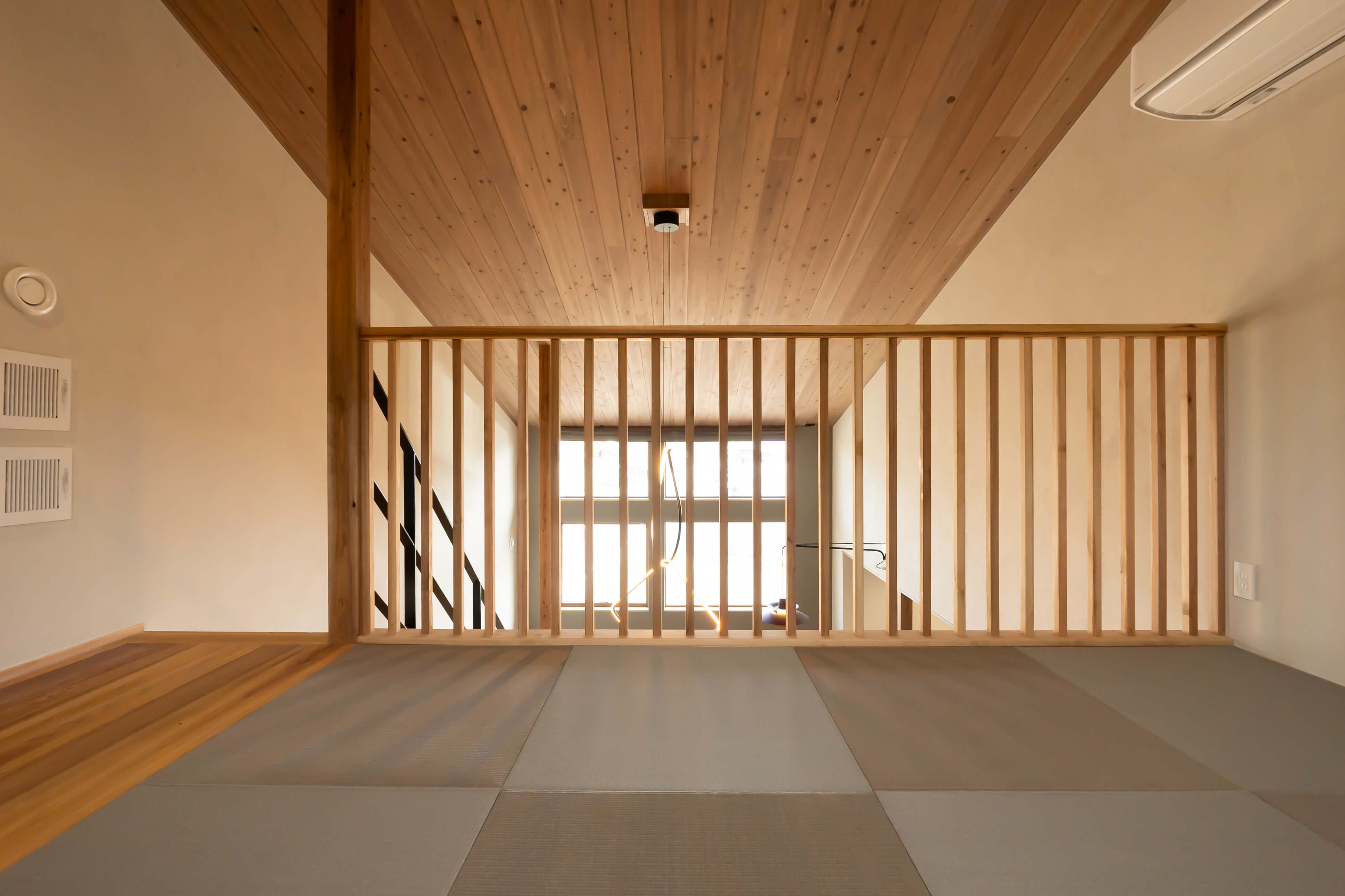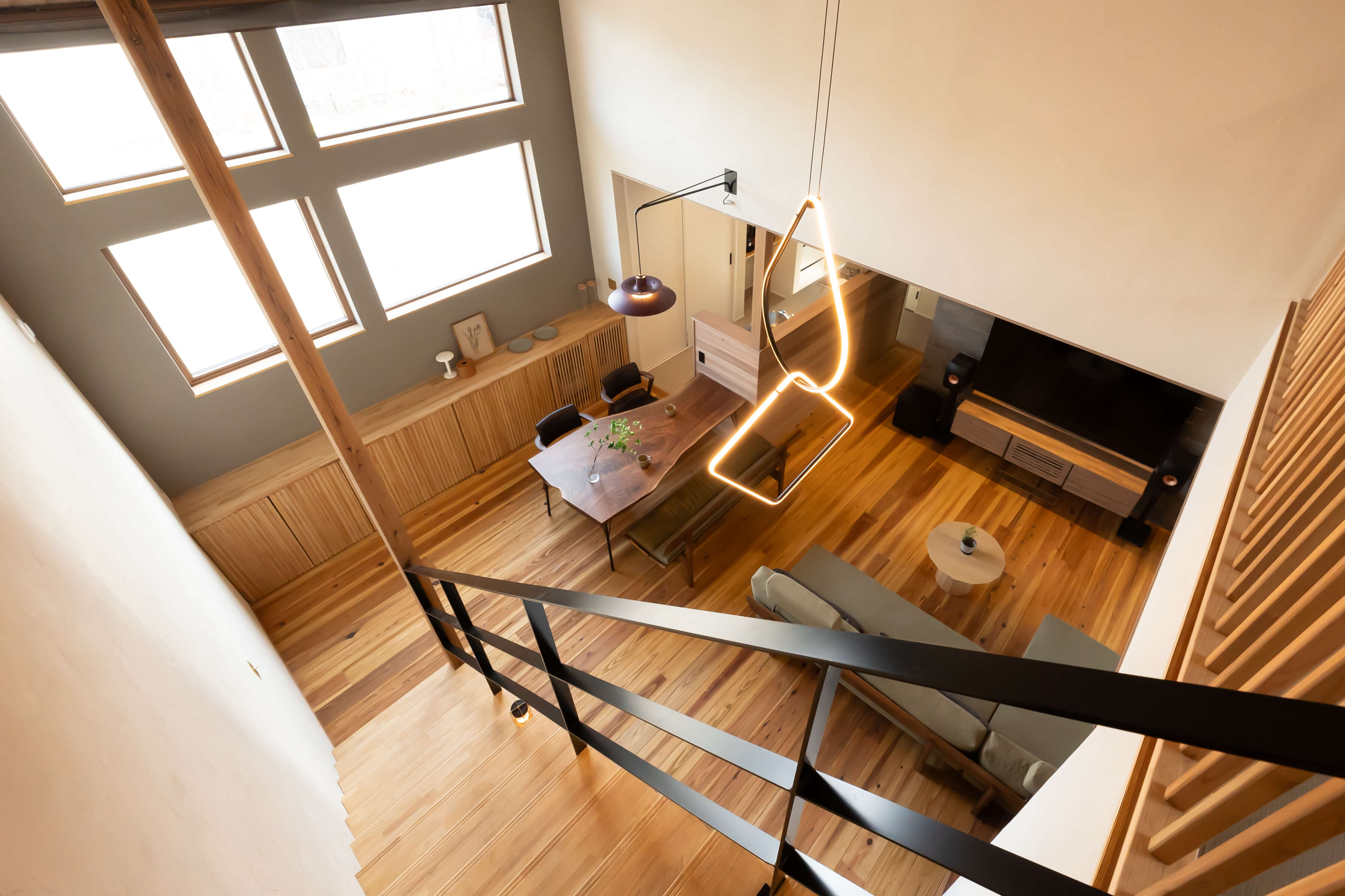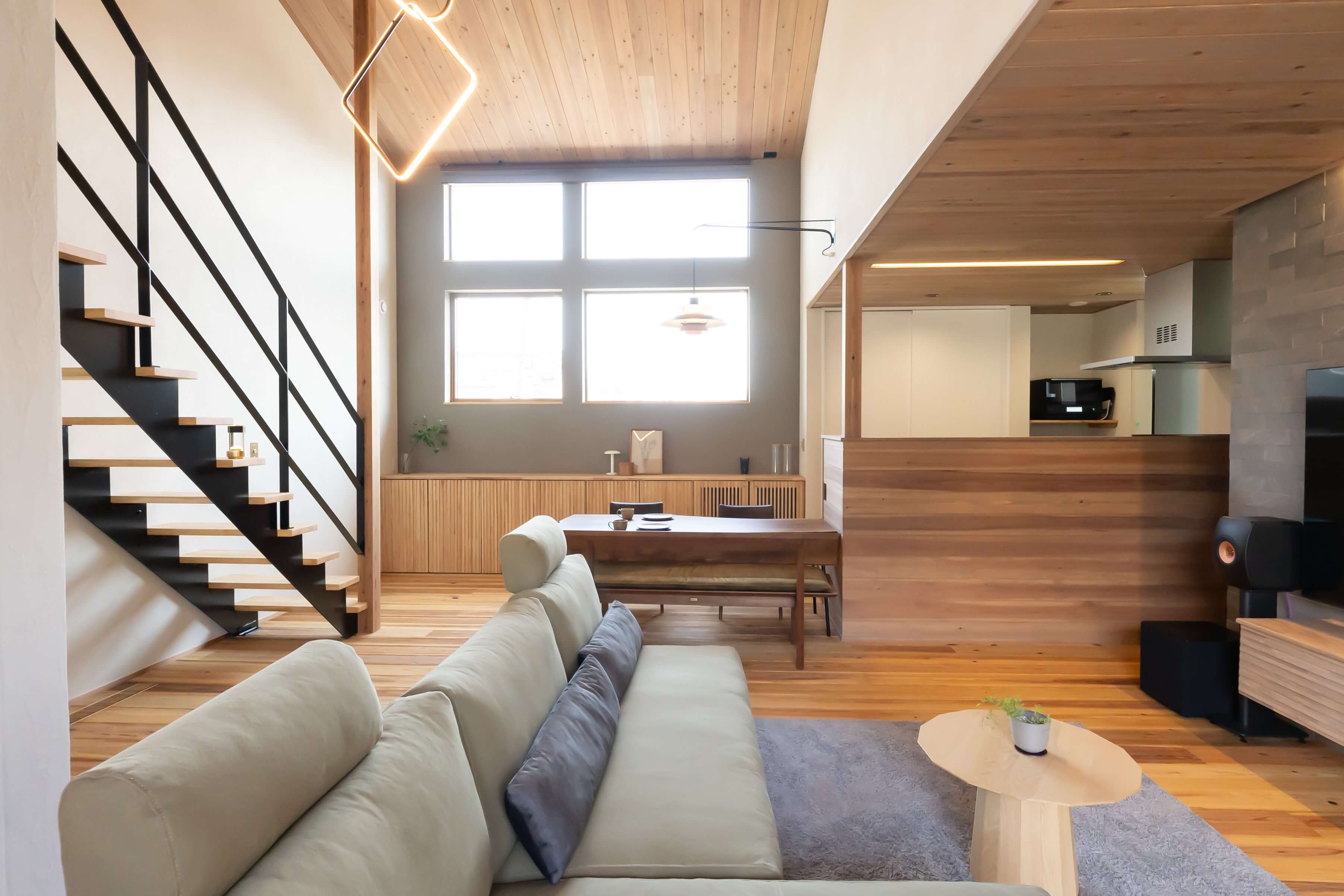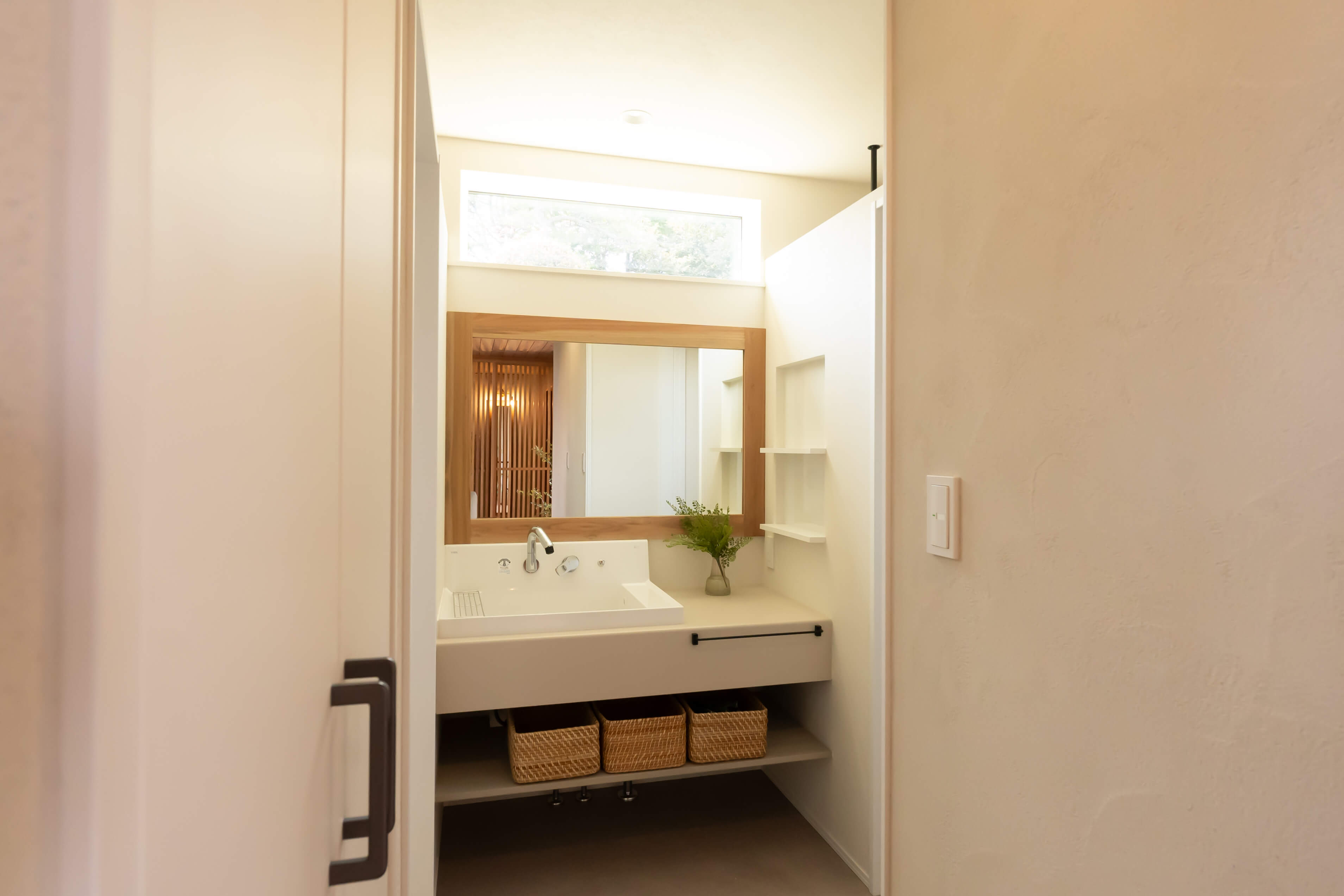 リビングと吹き抜けの南北に大きく開かれた窓が、陽と風、そして景色を心地よく取り込む快適な家。大きな吹き抜けがある24帖のLDKは、庭や空を眺めることができ、デッキや2階の応接スペースも設けたことで、来客との時間も愉しむことができます。玄関に入ってすぐ見える洗面も脱衣、ランドリーと分けたことでプライバシーを守りやすく、来客を呼びやすい間取りに。