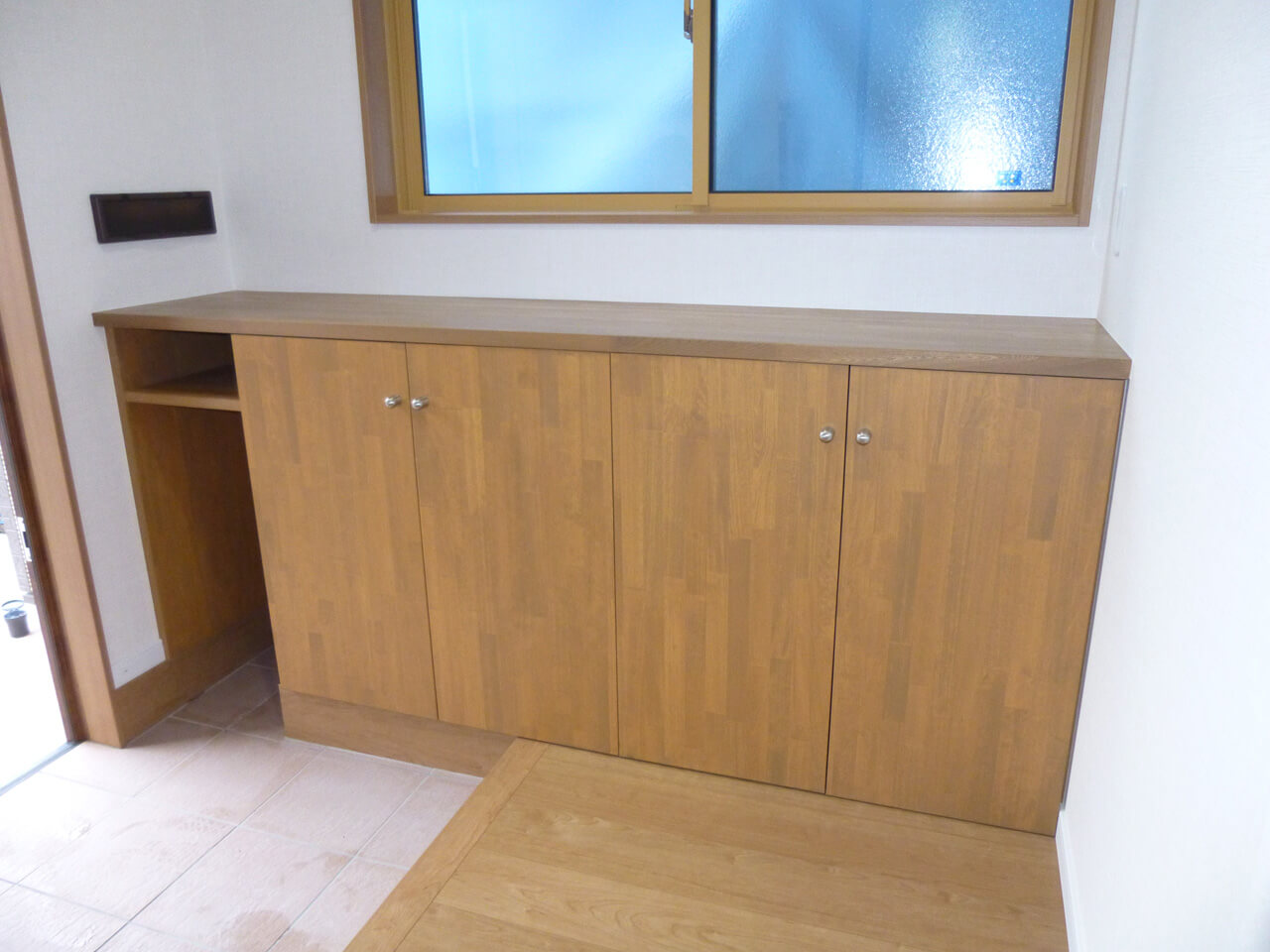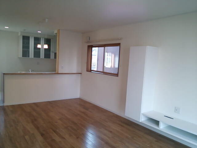 暖かさを重視されていたお客様のためにリビングの床には冷えにくい無垢材を使用し、造作したテレビボードやパソコン用カウンターを設置しました。