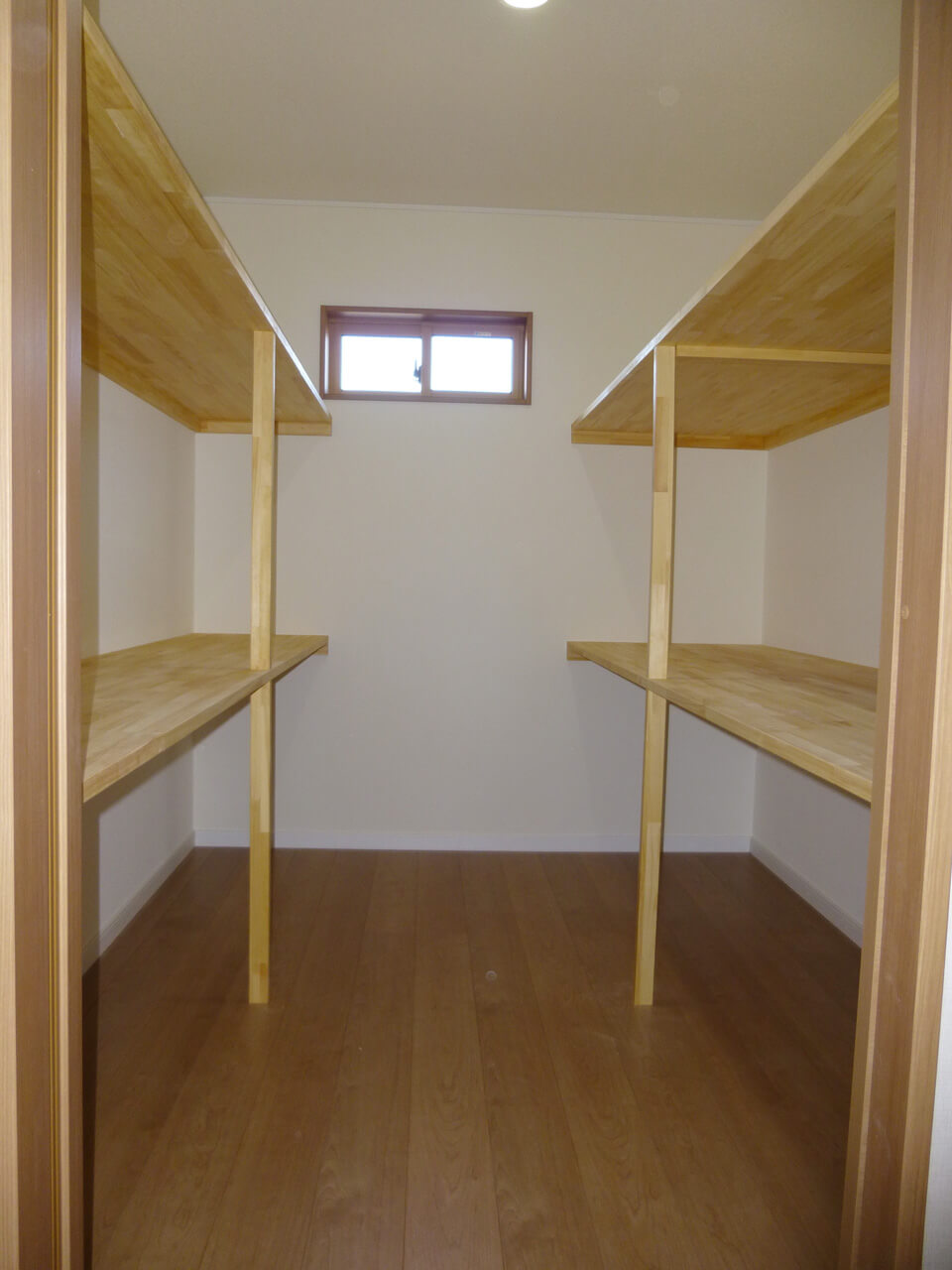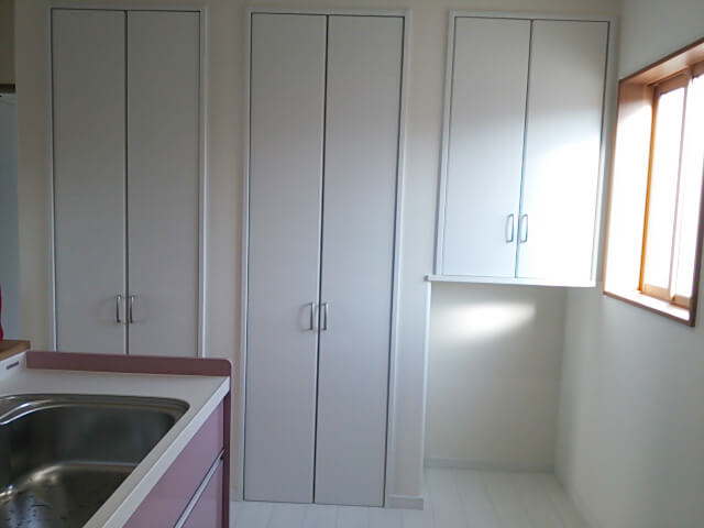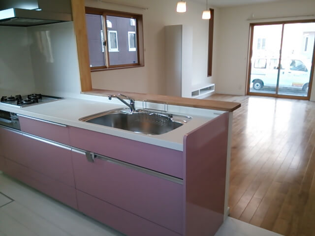キッチンは白の床とI型キッチンの片側のみピンクの扉にするなど、可愛らしい雰囲気に仕上げました。荷物がたっぷり入る納戸やウォークインクローゼットを確保して納力も十分です。
