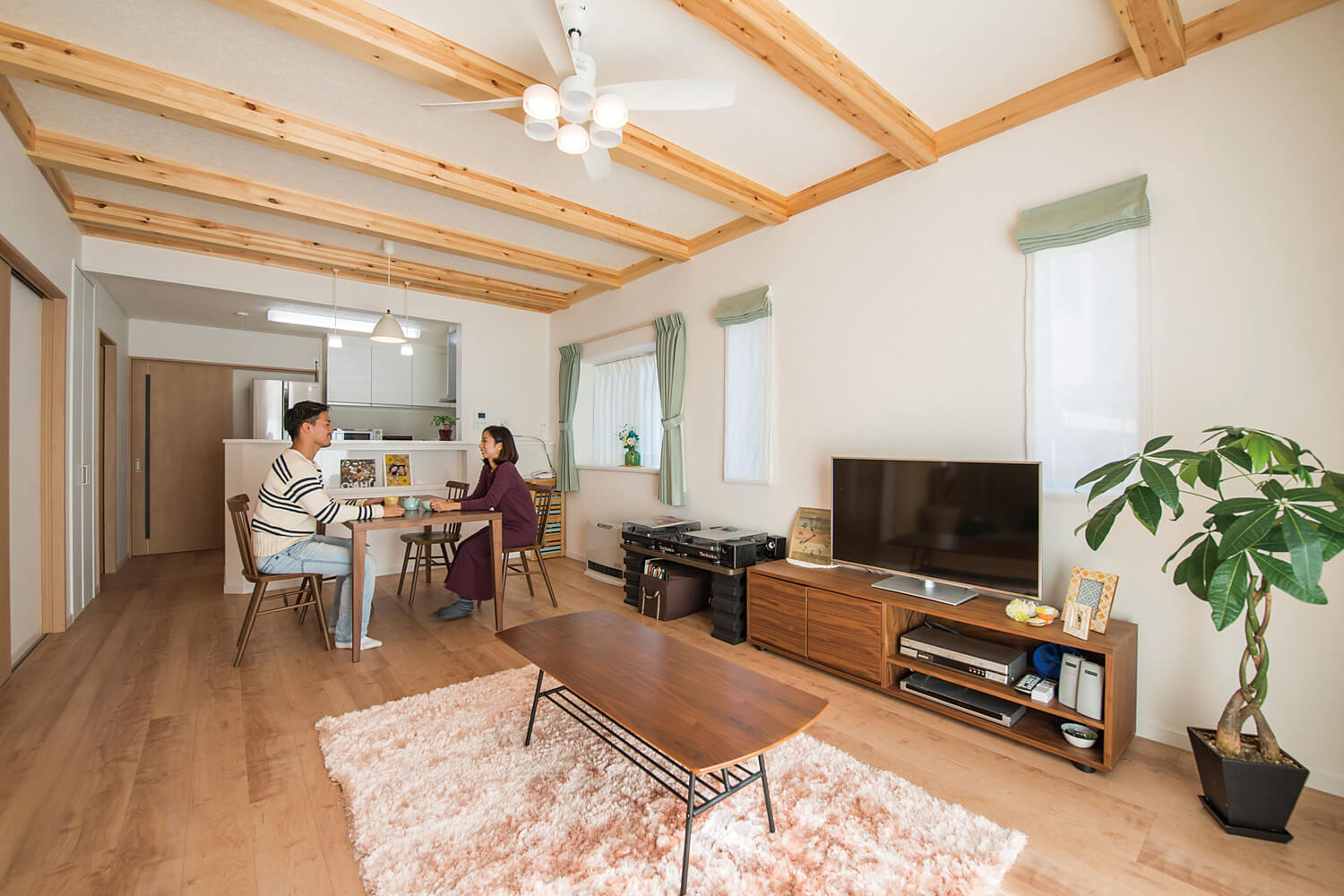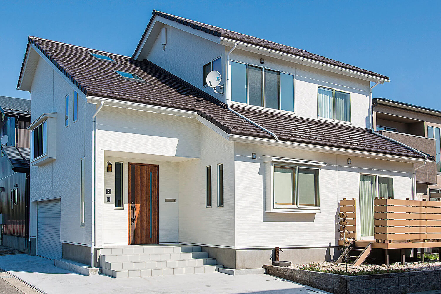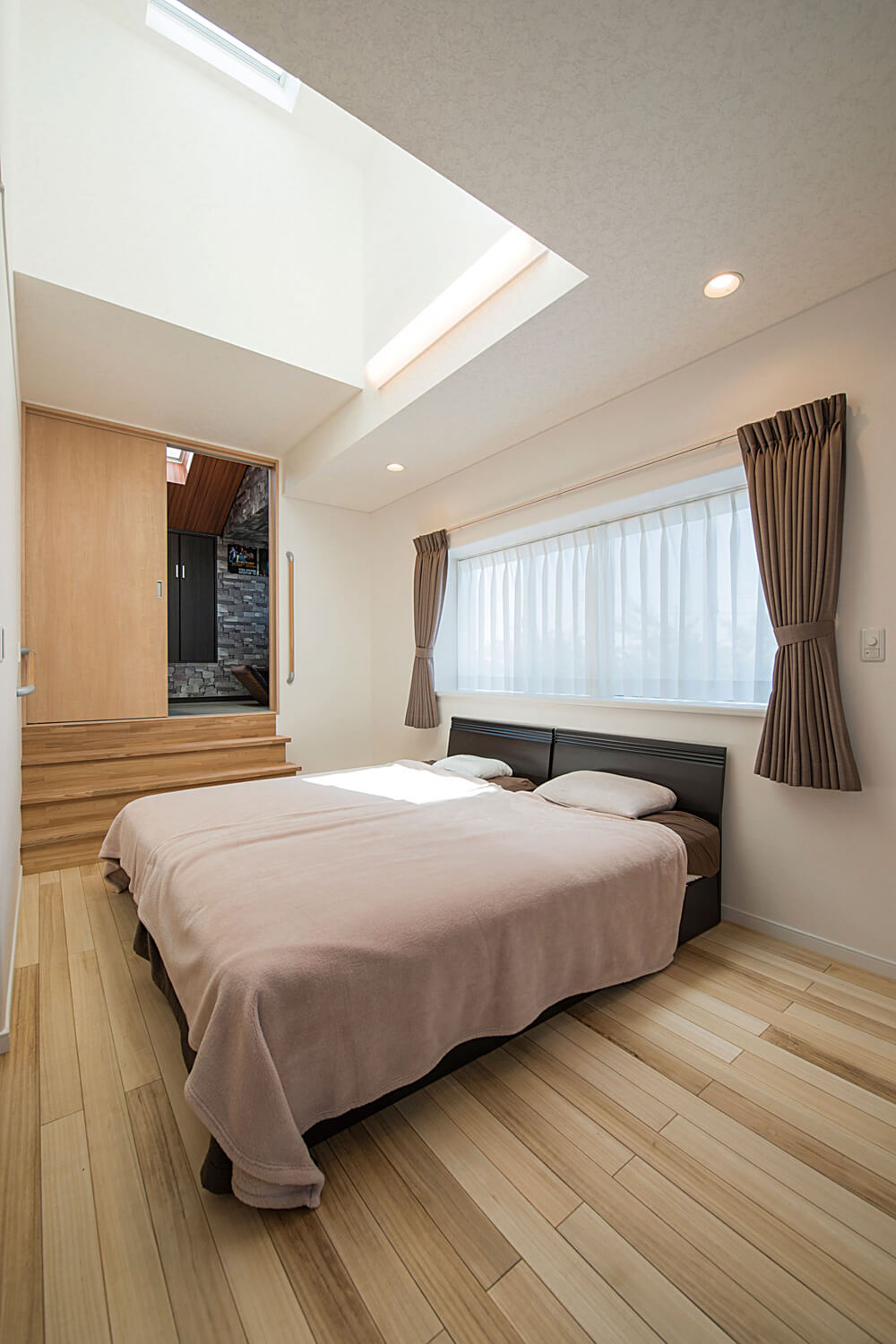 真っ白な外壁や、リビングの梁出し、淡い色のフローリングなど全体通して奥様の好みである優しく柔らかい印象に仕上げました。中2階にある夫婦の寝室は天井高を活かした天窓から明るい日差しが差し込みます。
