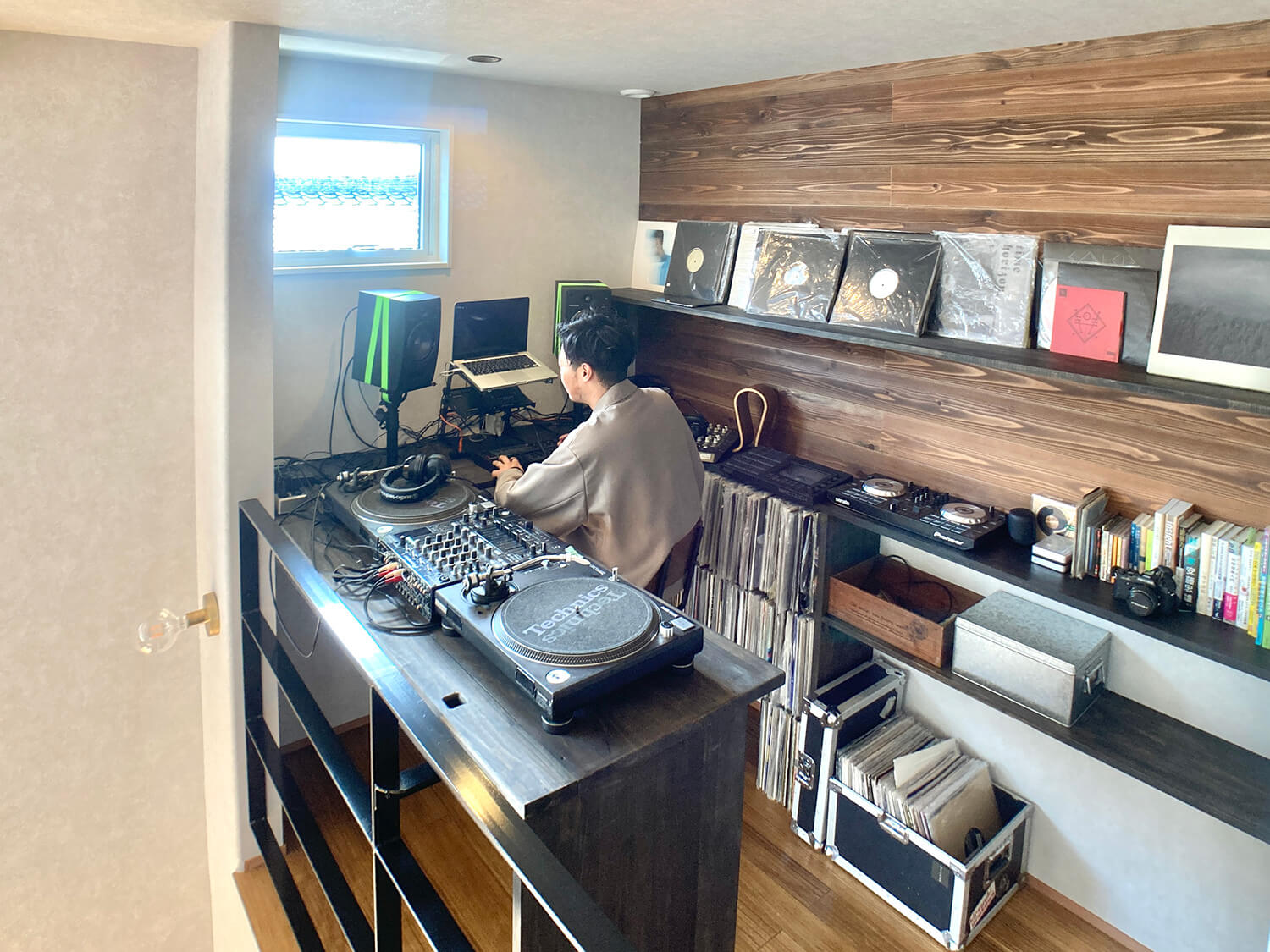 デザインは、美容師さんならではのお洒落な雰囲気に、夜もまた違った家の表情が楽しめます。吹き抜けから覗ける2階のホールにはご主人の趣味であるDJのブースを配置しました。